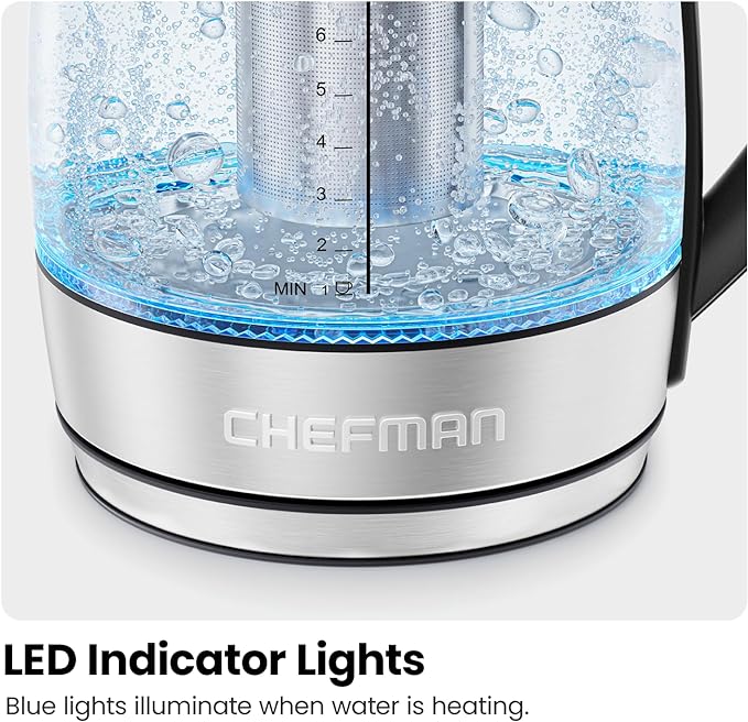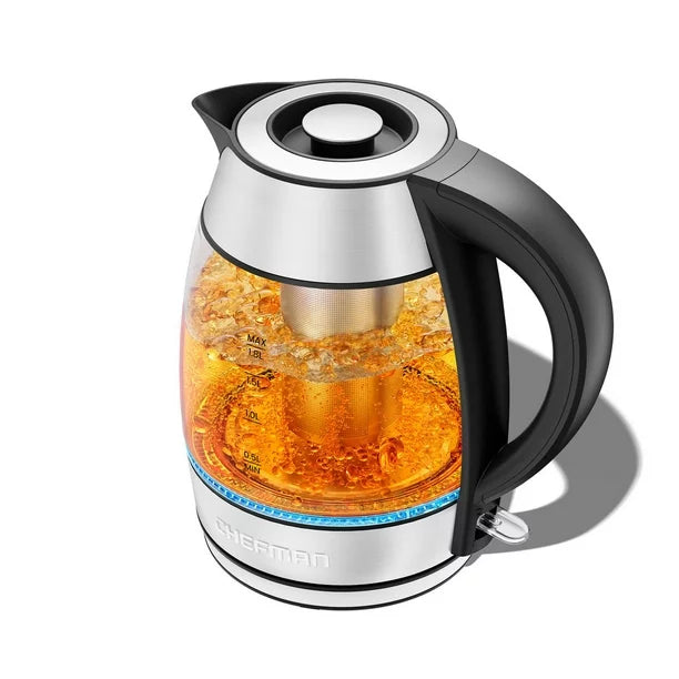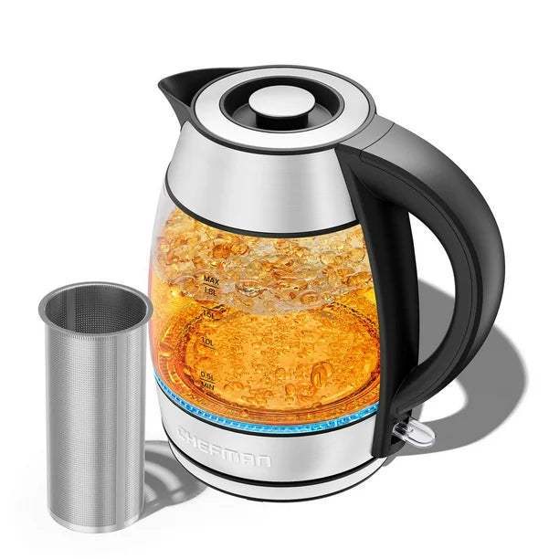 Brewing your favorite hot beverage has never been this easy! Whether you’re making loose-leaf tea or bagged tea, hot chocolate, coffee, soup, or even sterilizing water for a baby bottle, the Chefman 1.8 Litre Cordless Glass Kettle has got you covered. Beautifully bright blue LED lighting illuminates during boiling, and 1500 watts of power boil water faster and 85% more efficiently than stovetop kettles. The tempered, stain-resistant, and BPA-free borosilicate glass was built to withstand high temperatures, while the concealed stainless steel heating element automatically shuts off for boil-dry protection. The ergonomic cool-touch handle was designed with your comfort in mind, and the 360° rotating base lifts and returns cleanly for both right- and left-handed users for easy, cordless pouring. The large capacity makes it easy to brew for the whole day – or the whole family. Plus, the stainless steel exterior will display beautifully on your countertop.