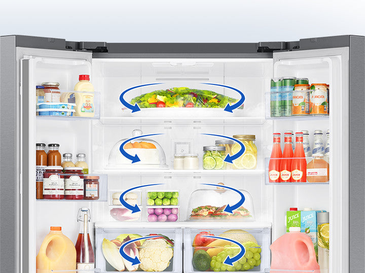 The Samsung RF22A4111SR incorporates the exclusive All-Around Cooling system, ensuring uniform temperature distribution throughout the fridge. This is achieved by circulating cool air through strategically placed vents, eliminating hot or cold spots and ensuring that all your food remains at the ideal temperature.