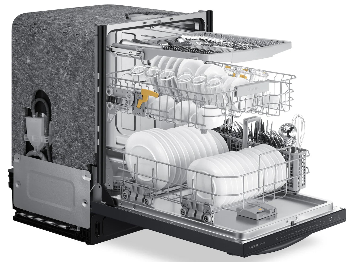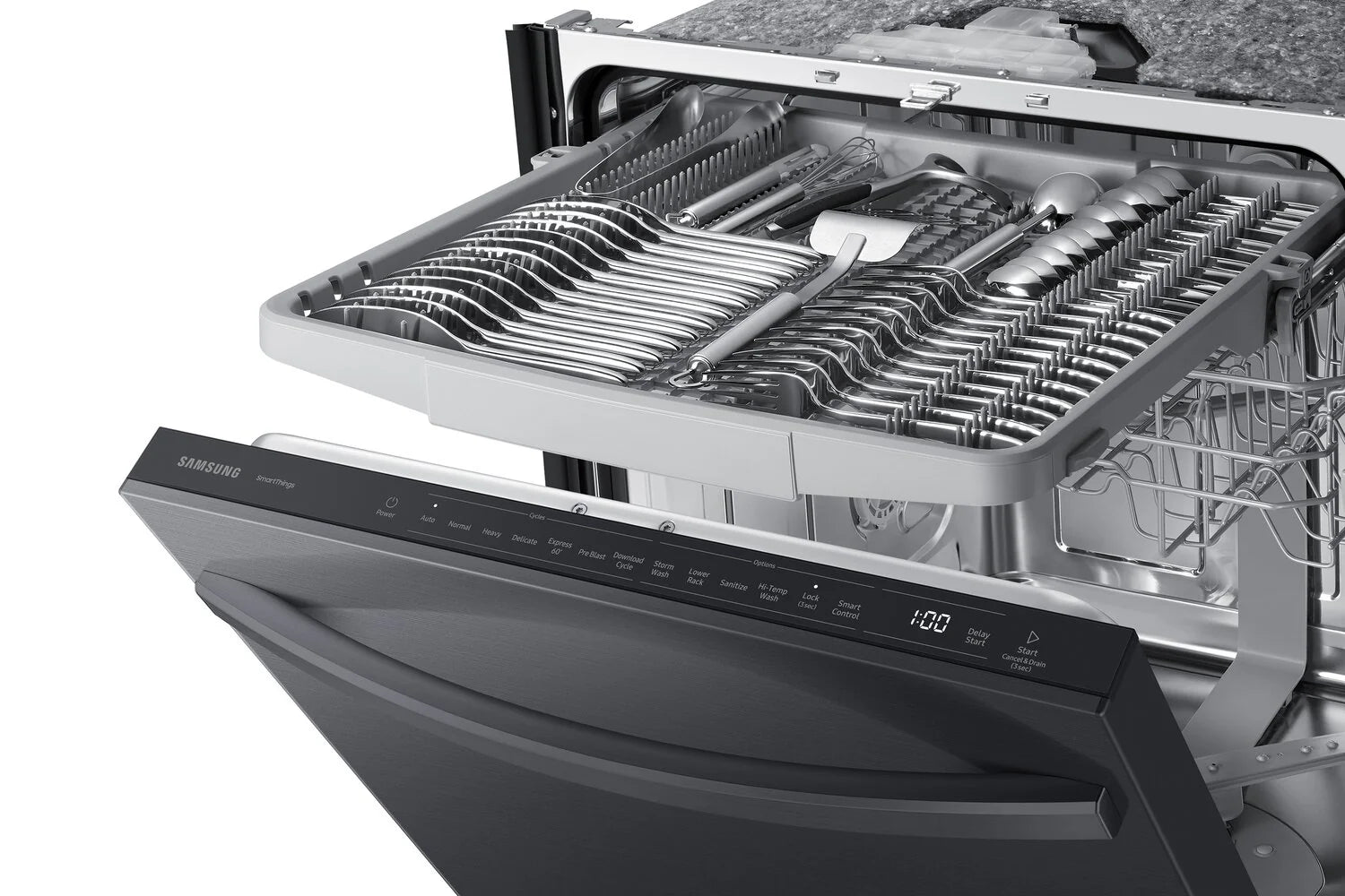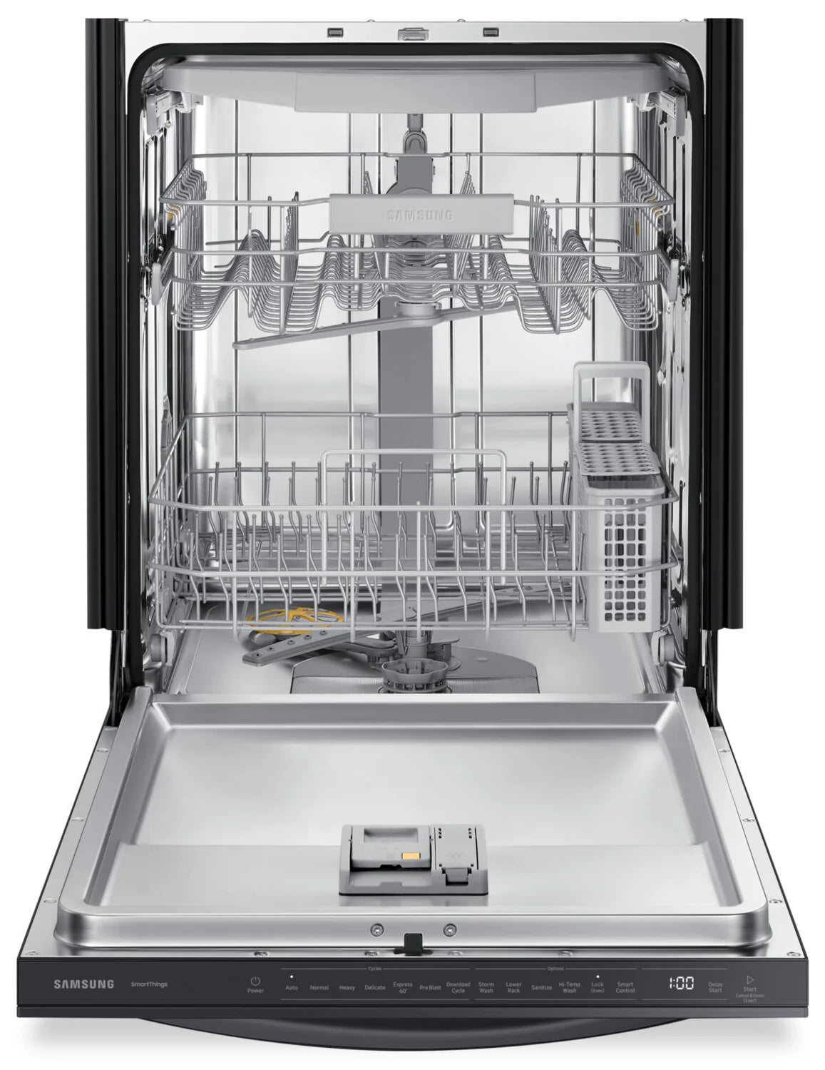 Upgrade your kitchen with the power of this Samsung dishwasher. The StormWash system blasts water from two washing arms, covering multiple angles for a thorough clean. Once the cycle is complete, the dishwasher door automatically opens to circulate air for better drying performance. From pots to spatulas, the third rack and height-adjustable upper rack provide all the loading flexibility you need. This dishwasher also meets Energy Star Certification requirements to ensure a more efficient and cost-effective cleaning experience.